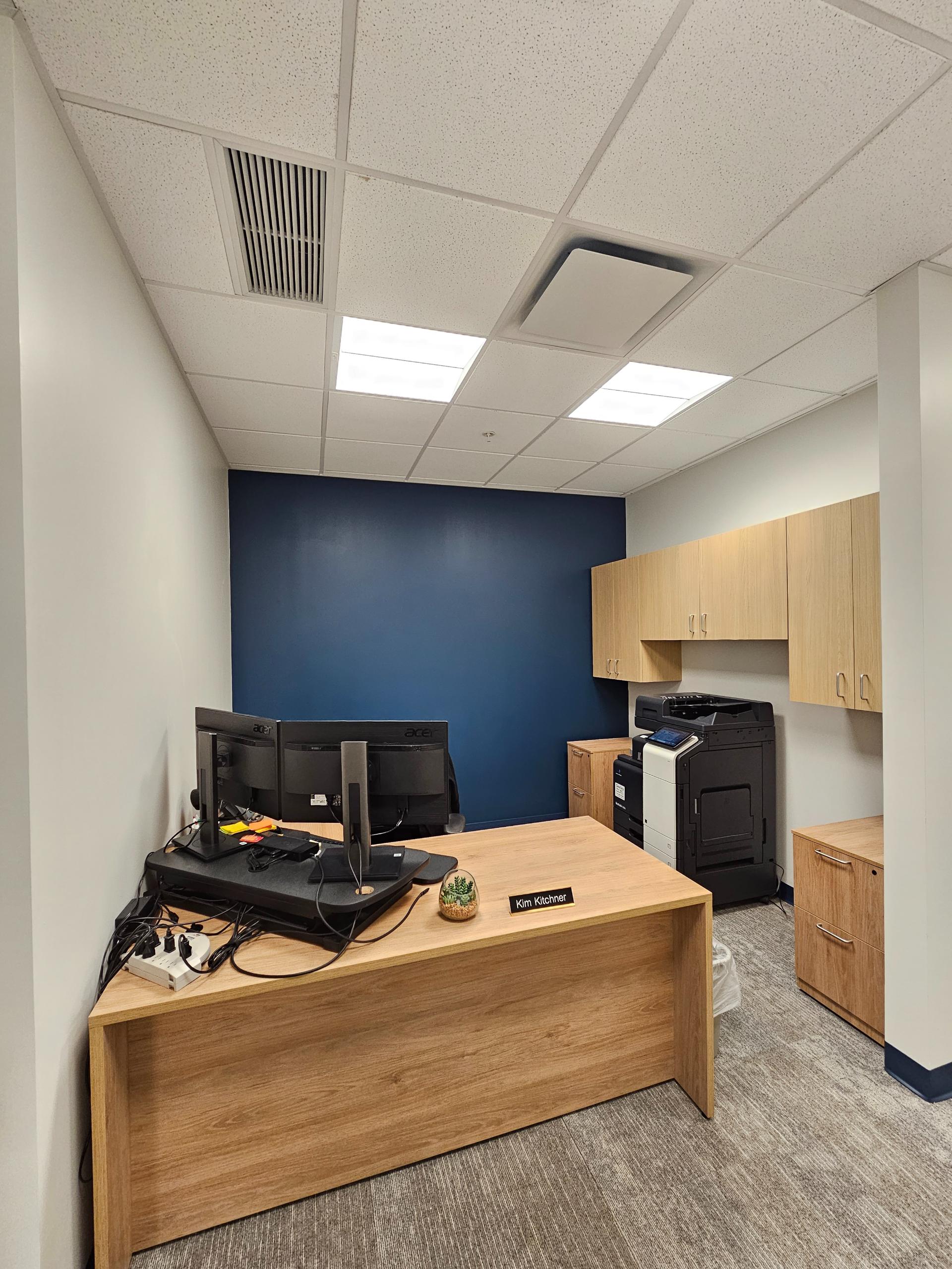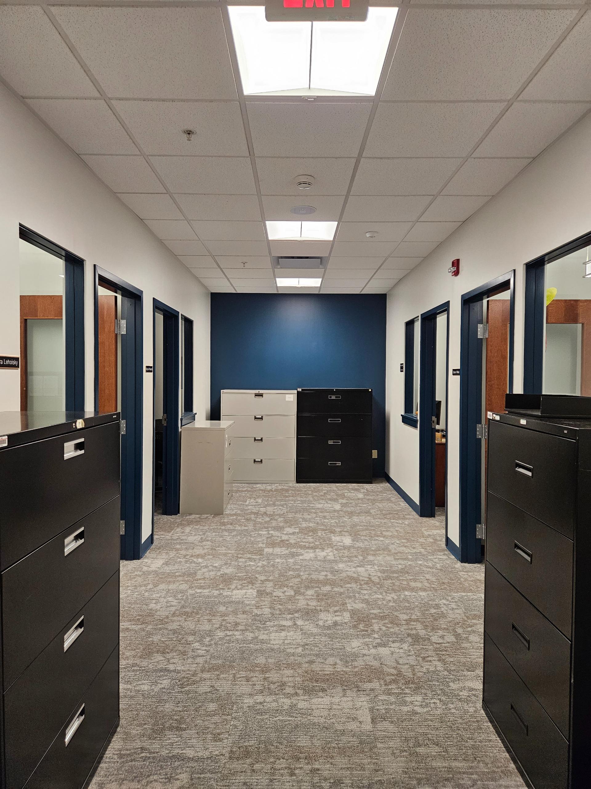 Complete office uplift featuring new interior windows and carpeting. Removal of old acoustical ceiling tiles with installation of new acoustical ceilings. All new lighting, office partitions, paint, and new wood office doors. Re-vamped copy room with upper cabinets.